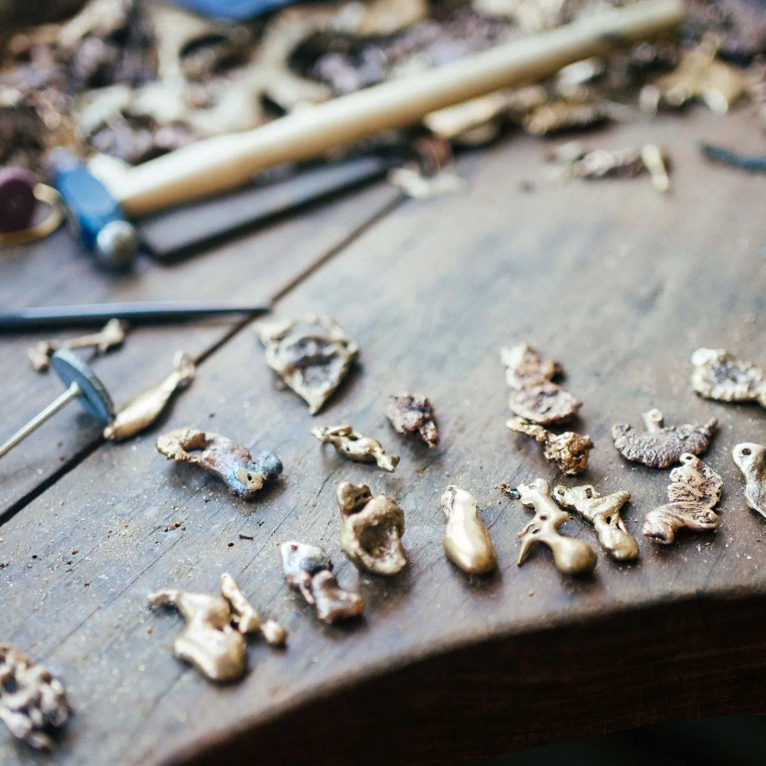Each piece starts as an irregular bronze form. Suzanne collects the fragments, then transforms them through vision and craft, carefully shaping and finishing each piece while preserving its organically formed appearance.