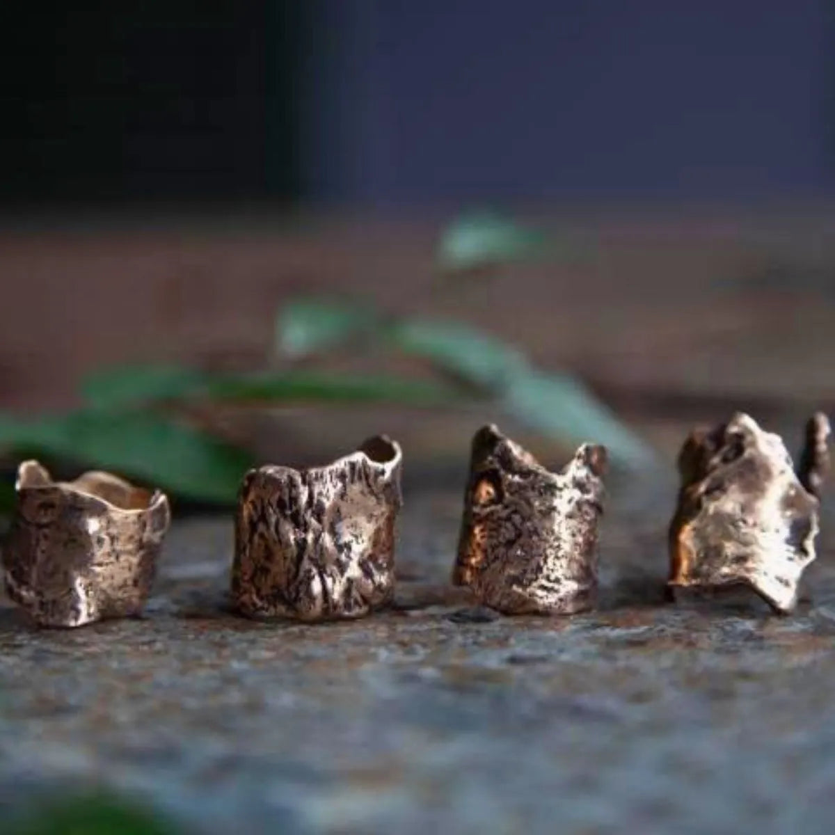 Foundry Collection pieces begin as reclaimed bronze ‘spill’ fragments formed during industrial casting at Newcastle Foundries (est. 1890). Each fragment is naturally unique, created by chance and refined by hand into wearable sculpture.