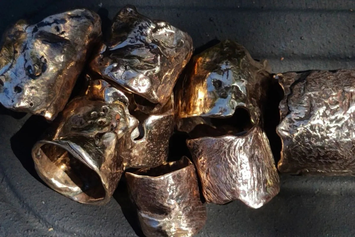 Foundry Collection is jewellery sculpture by Suzanne Curran made from reclaimed bronze spill created during industrial casting at Newcastle Foundries (est. 1890), refined into one-of-a-kind wearable sculpture.